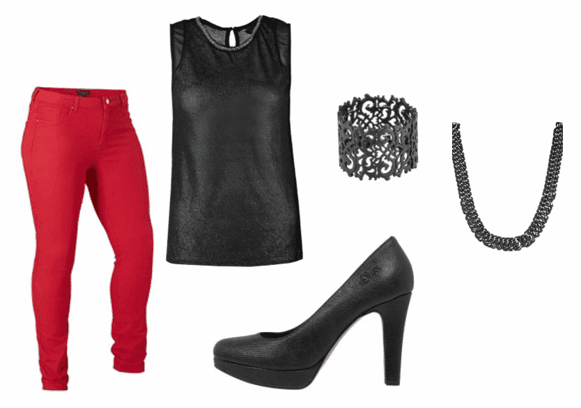Je mag gerust voor een kleurrijke outfit kiezen. Let wel, overdrijf niet, kies daarom voor een fel gekleurde broek/skinny. Pas daar een neutrale top bij en mooie oorbellen voor wat extra glitter en je bent klaar voor een onvergetelijke avond.